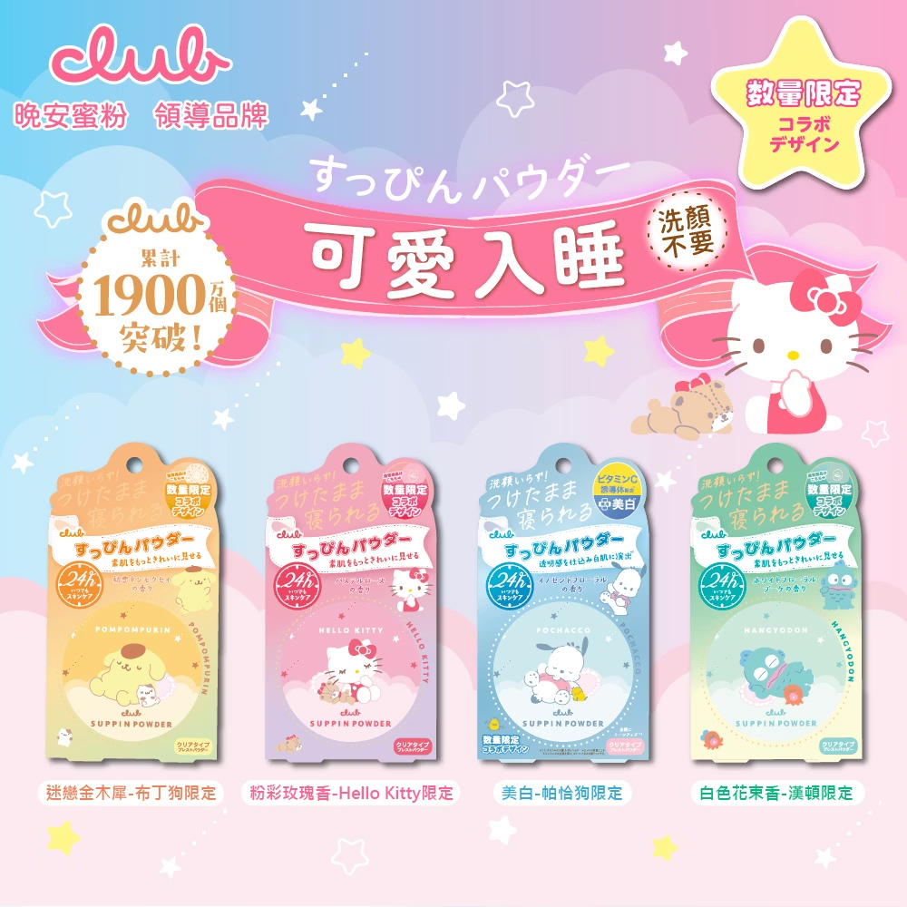 【日日美鋪】可愛暴擊🎀日間修飾、夜間保養🥰給你素顏好氣色✨擁有日雜透明美肌💎CLUB 素顏美肌晚安蜜粉餅 三麗鷗2026聯名款(隨機提供2款),總價值$1340元,招募10位