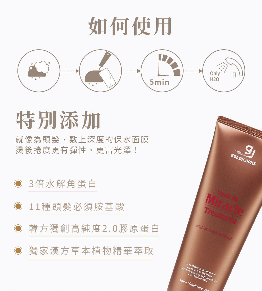 用法:洗髮後以毛巾擦拭至不滴水的狀況,長髮取韓金修護髮膜約$50的量均勻抹於頭髮上,用手指或寬齒梳輕柔按摩勻均,以熱毛巾或浴帽包包裹,停留5~10分鐘後,用溫水沖淨即可,從稻草頭變絲綢感,只需要10分鐘!