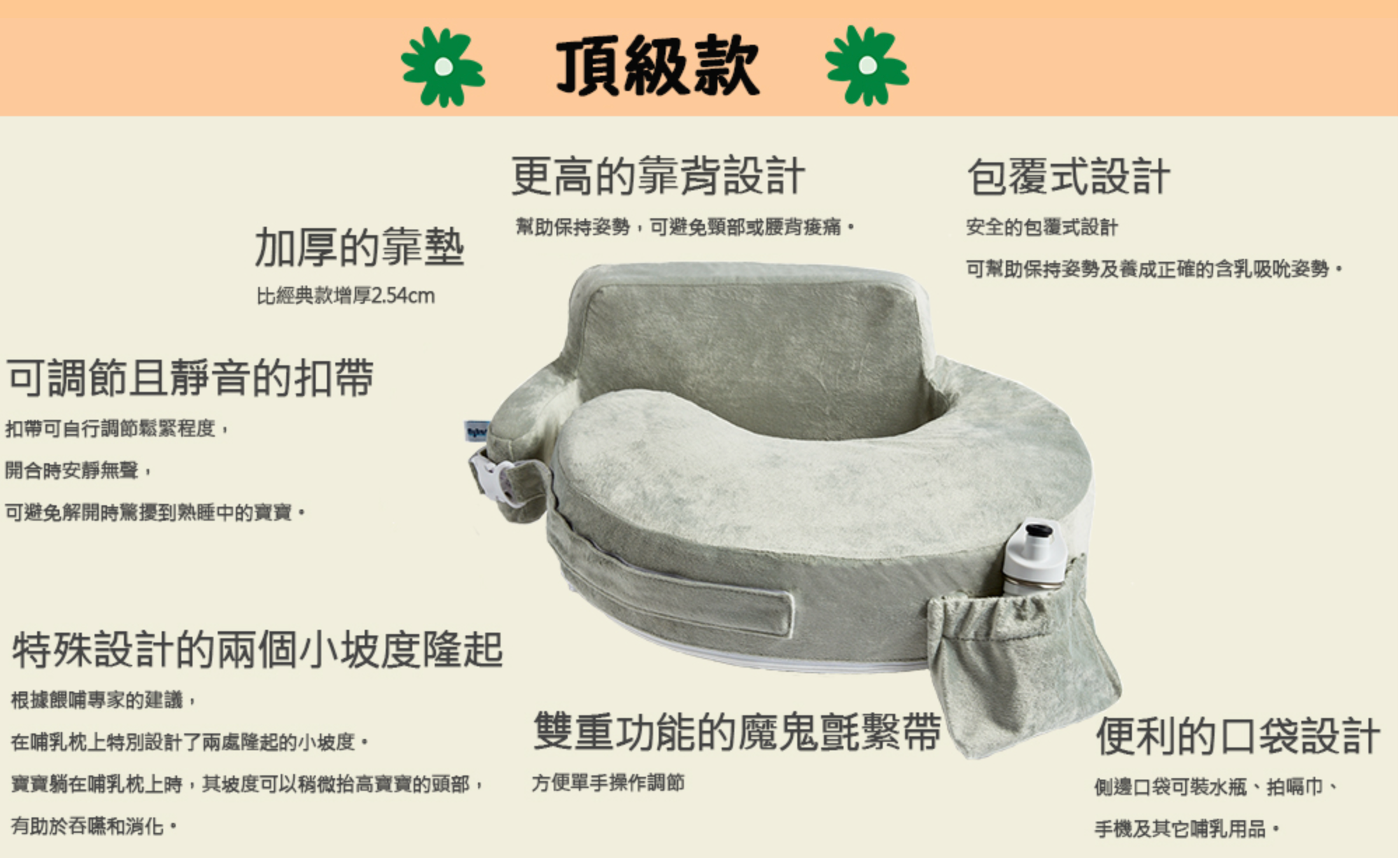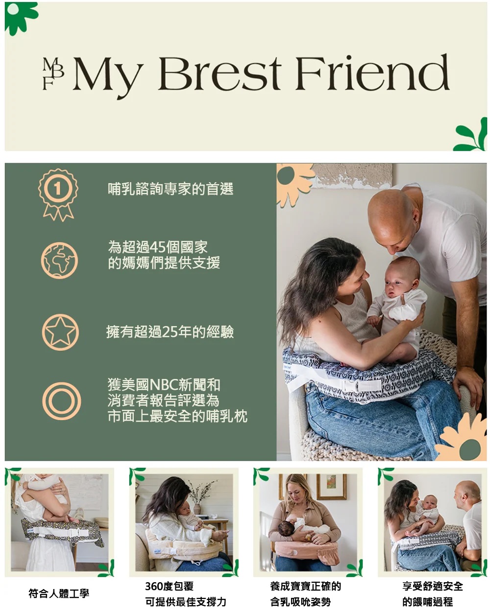 3. 請分享產品品牌及產品特色,如:品牌理念、符合人體工學、360度包覆支撐力、養成正確哺乳姿勢、便利的口袋設計、可調節式扣環、布料親膚清潔方便、美國明星媽媽首選、美國消費者報告評選為最安全哺乳枕等。請參考產品詳細資訊後內化自身體驗心得,切勿完全照抄官網資料喔!