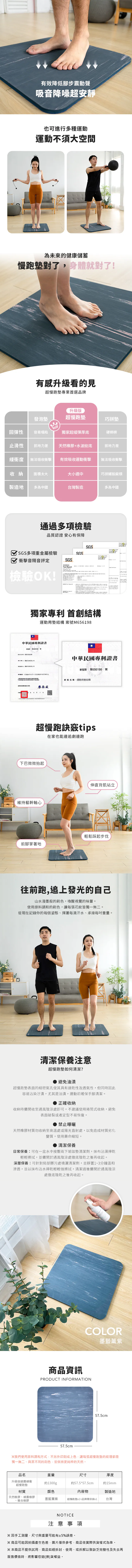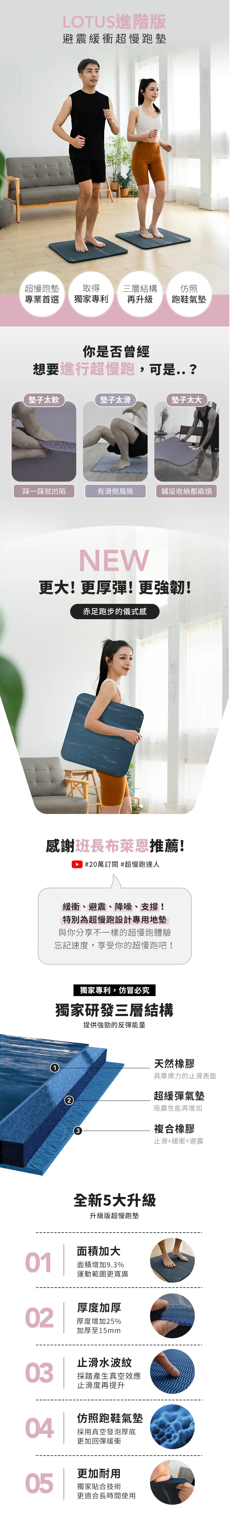 2. 請自然帶入產品的優勢,例如:嚴選天然橡膠與紋路超防滑設計、頂級跑鞋氣墊技術、滿滿回彈力跑更久、15mm厚度更舒適、大面積、台灣製造等,也歡迎在文章中分享超慢跑墊&瑜珈墊差別(瑜珈墊因太薄彈性不足,不適合用來超慢跑,易造成運動傷害)。