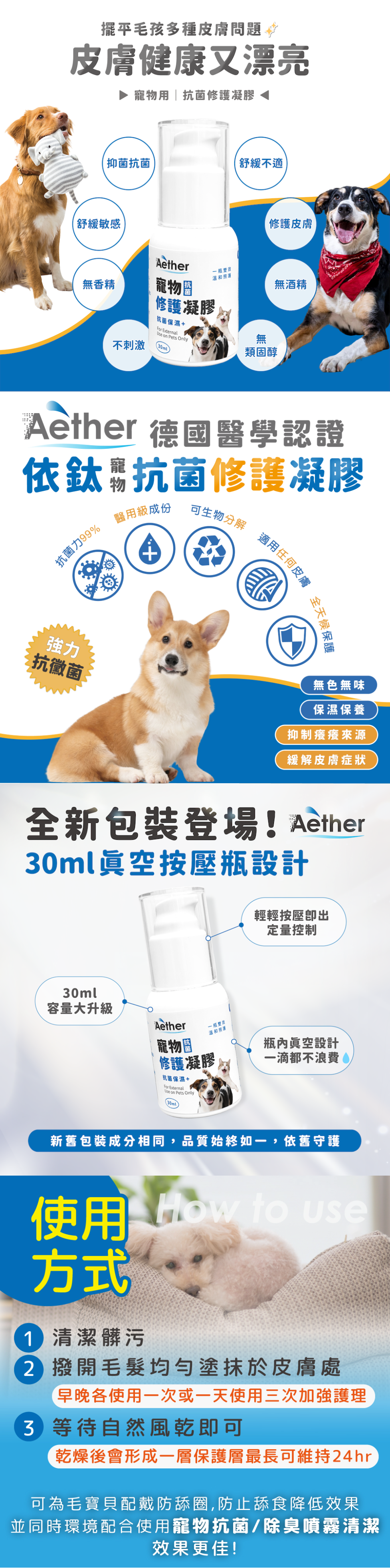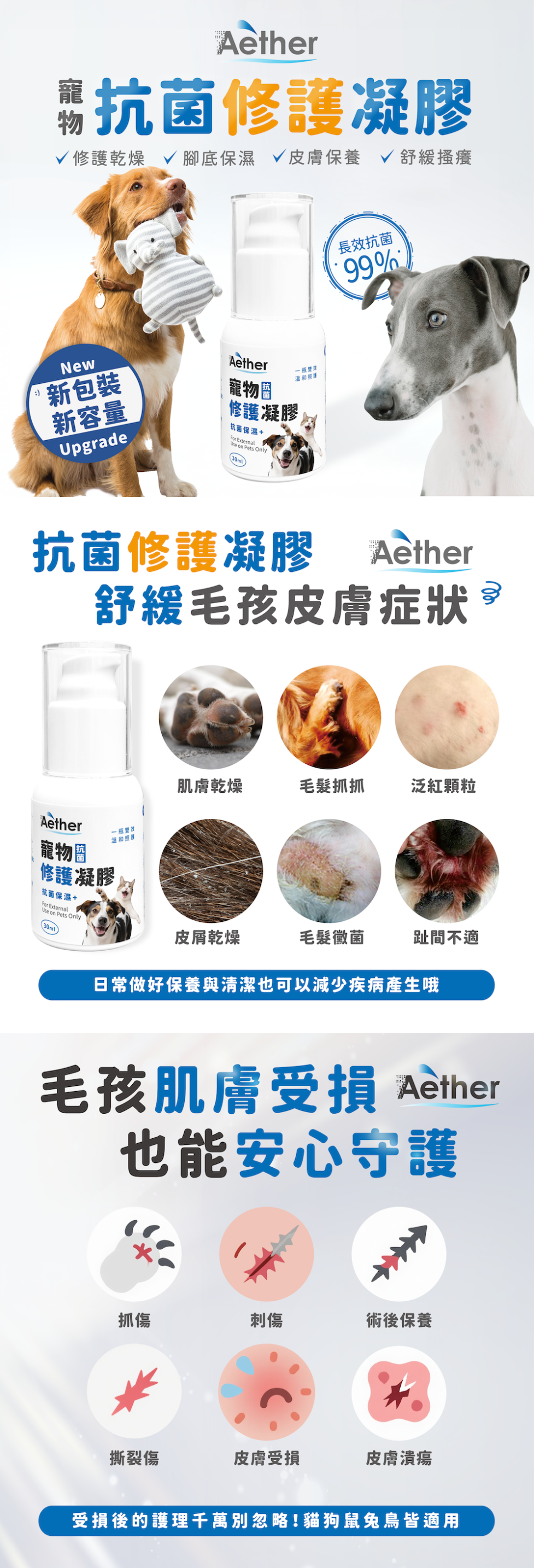 ・寵物抗菌修護凝膠:肌膚局部保養、乾燥不適時加強修護