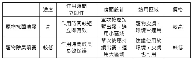 因兩者內容物相同,但綜觀以上比較,大量使用於廣泛區域時使用寵物除臭噴霧會是更划算的選擇,而寵物抗菌噴霧則是萬用款。