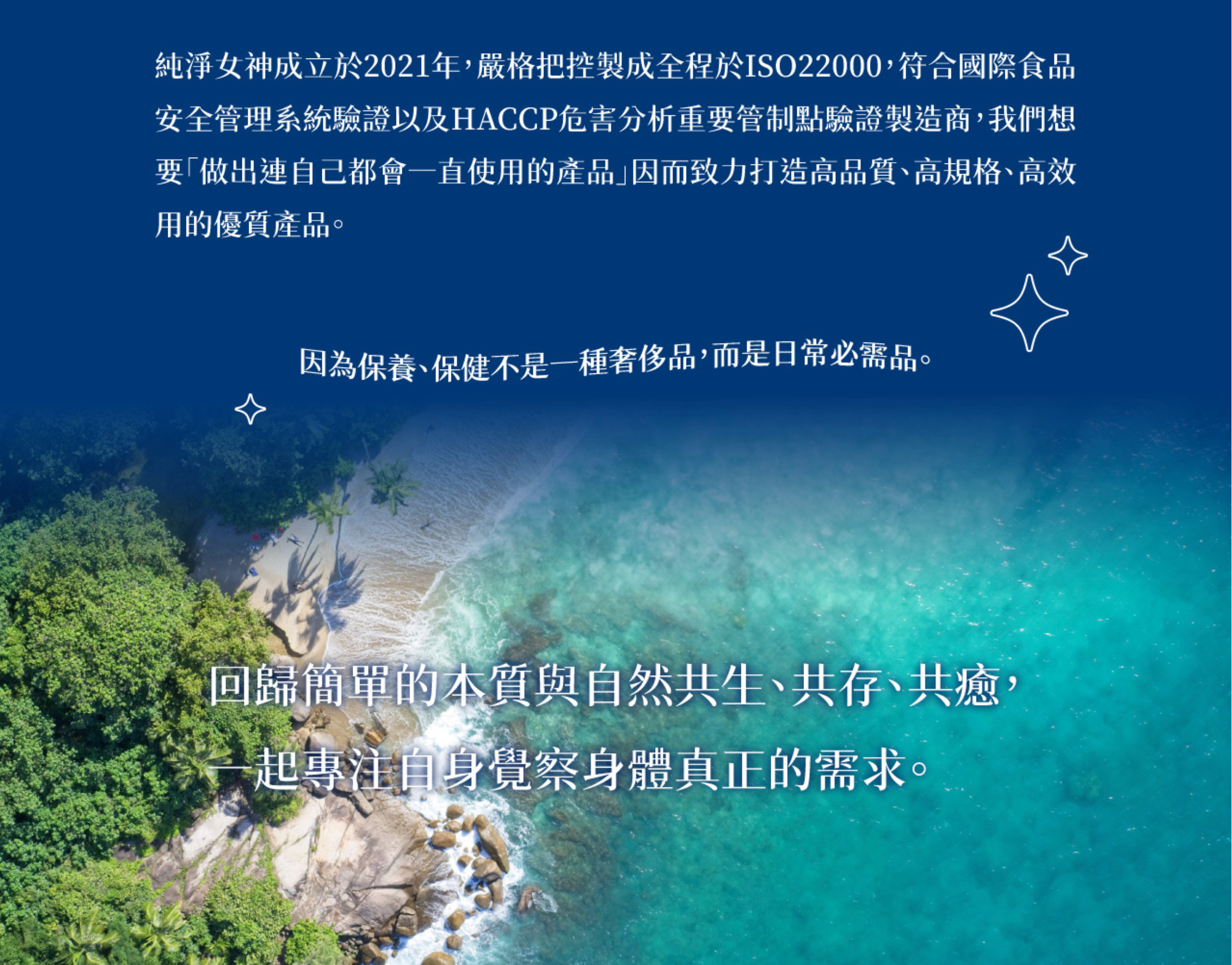 品牌創辦人以懷抱大自然環境、健康、崇尚天然生活藝術的概念出發,期許可以創造能滋養身、心、靈的恆久純淨之健康保養、保健品